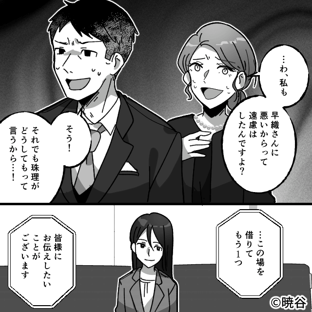 娘が主人公に欠席を求めているときの証拠の映像が流れ、夫と娘は青ざめます。 父は「これはどういうことだ?」と夫を問い詰め、夫は必死に言い訳をするのでした。