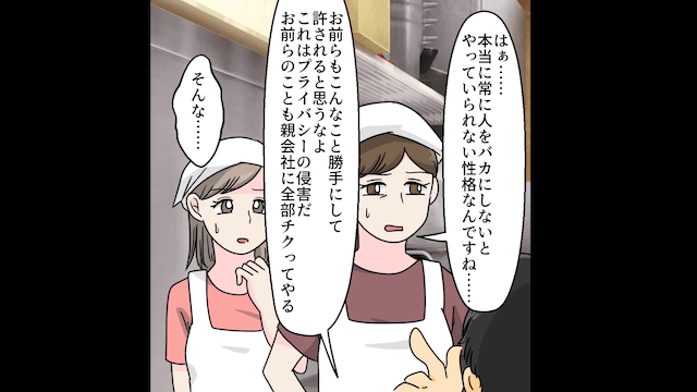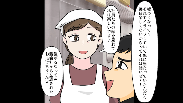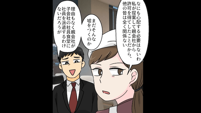 周りから白い目で見られた男性社員は「親会社にチクるぞ!」と主人公を脅してきました。 しかし主人公は「まったくもって問題ないですよ。私も親会社から来た人間だから直接話もできるので」と反論。