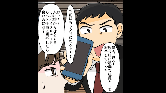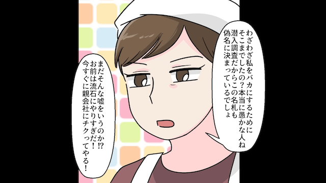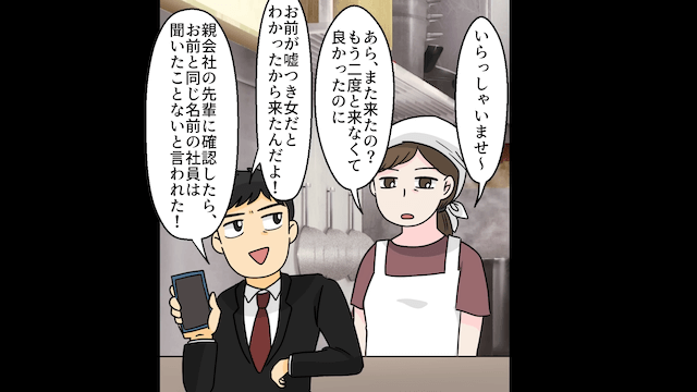 今回は『社員食堂で…社員「使えないな、おばさん!」私「クビね」直後⇒私の【正体】を明かした結果』を紹介します。 主人公の発言が気になり、親会社にいる先輩に確認を取った男性社員。 すると主人公と同じ名前の社員はいないと言われ、男性社員は主人公が嘘をついたのだと考えて…。