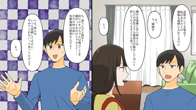 主人公は夫に職場復帰を宣言し、代わりに夫が主夫になればいいと提案しました。 すると夫が嫌がったため、主人公は「あなたが職場でちょっかいをかけている後輩と離れるのが嫌とか?」とカマをかけたのです。