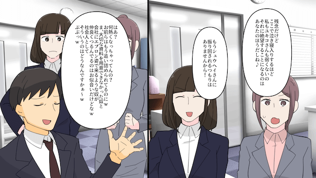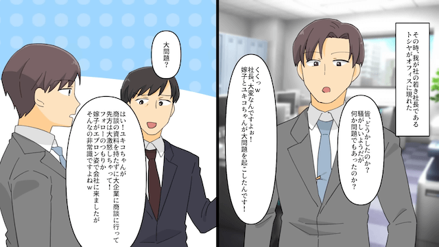 主人公が事情を説明すると取引先の社長も激怒し、その場で話し合って夫に反撃するための作戦を立てました。 その後、主人公たちが商談に失敗したのだと勘違いした夫は「2人が大問題を起こしたんです!」と嬉しそうに社長に報告。