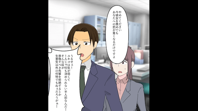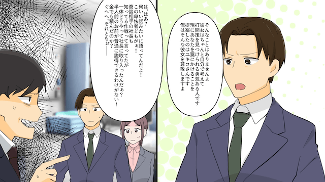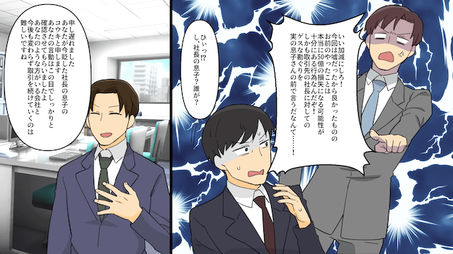 主人公と女性社員が社長に経緯を説明すると、夫は女性社員に責任転嫁をして怒鳴りました。 さらに夫は取引先の社長のことも侮辱し始めたのですが、その場に取引先の社長の息子がいることに気づき、青ざめて…。