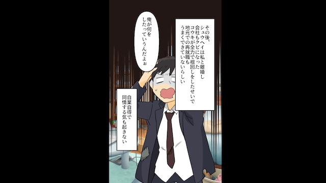 女性社員や社長に突き放された挙句、主人公に離婚を突きつけられ、絶望した夫。 その後、離婚は無事に成立し、夫は会社をクビになりました。