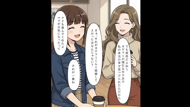 すべてが終わりホッとした主人公は「これからは私の人生を生きる!」と決意します。 その後、父が勤める会社と夫の会社に関わりがあったことで夫は会社をクビになり、主人公は娘と2人で幸せに暮らすのでした。