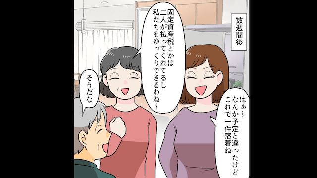 義姉が強引に家に入ろうとしたため、家を売却して実家で暮らし始めた主人公。 その後、主人公夫婦がいなくなったことを知った義両親と義姉は、無断で家に住みついて…。