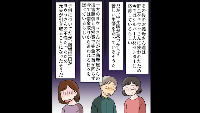 義両親は仕事を探すもののなかなか見つけられず、義姉は損害賠償などの支払いで借金を抱え、親子そろって苦しい生活を送る羽目に。 一方、主人公は念願の書道教室を開き、充実した毎日を送るのでした。