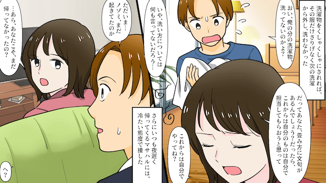 夫は毎日のように主人公を見下し、その態度の変化から主人公は浮気を疑うようになりました。 そして反撃を決意した主人公が夫の家事を放置すると、夫は次第に落ち着かない様子を見せ始めて…。