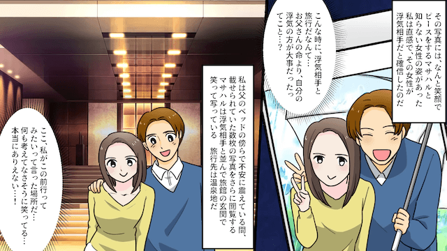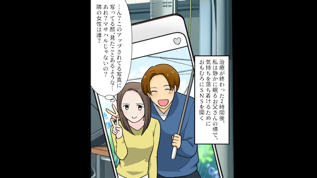 父の容体が急変したと連絡を受けた主人公は、慌てて病院に駆けつけますが、夫は旅行を優先しました。 そして数時間後、主人公がSNSを確認すると、そこには浮気相手と旅行を満喫する夫の姿が写っていて…。