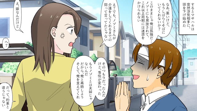家にやってきた夫と浮気相手は話し合いを求めてきましたが、主人公はそんな2人をきっぱりと突き放しました。 追い詰められた夫は浮気相手に再婚を迫りますが、もともとお金目当てだった浮気相手はあっさり夫を見捨てて…。