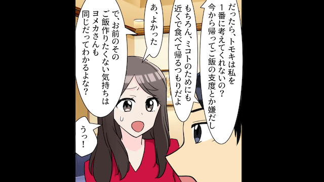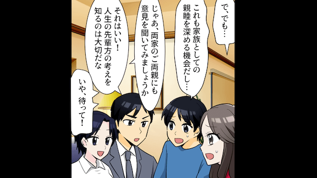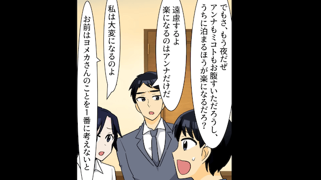 主人公が夫と義兄嫁を説得しようとしていたそのとき、義兄が家にやってきて2人を注意してくれました。 しかし夫と義兄嫁が納得しなかったため、主人公が「両家のご両親にも意見を聞いてみましょうか」と提案すると、2人は焦って主人公に謝罪をしたのです。