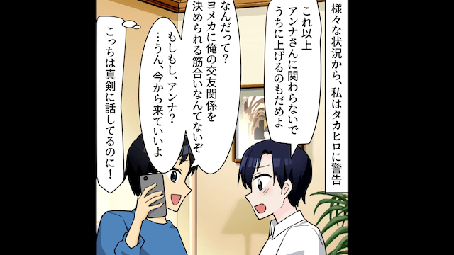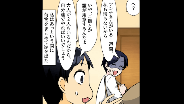 義兄嫁が再び頻繁に家に来るようになったため、主人公は夫に文句を言いますが、夫は「嫉妬してるんだろ」とずれた発言をしてきました。 そこで主人公は義兄嫁が泊まる1週間、外泊をすることにしたのです。