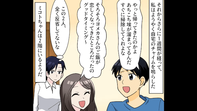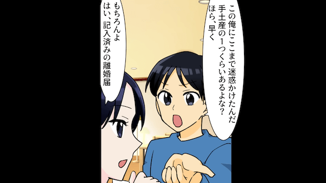 家事の大変さに気づいた夫は主人公に助けを求めましたが、主人公は夫の連絡を無視しました。 その後、主人公が帰宅すると、怒った夫が手土産を要求してきたため、主人公は離婚届を手渡して…。