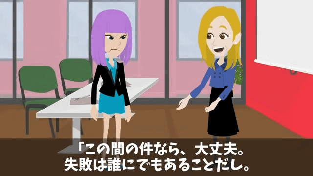 新人は仕事のことで悩んでいるから話を聞いてほしいと主人公に頼みます。 そして会議室で新人が先日のことを謝ると、主人公は「また次に活かせればいいから」と優しく伝えました。