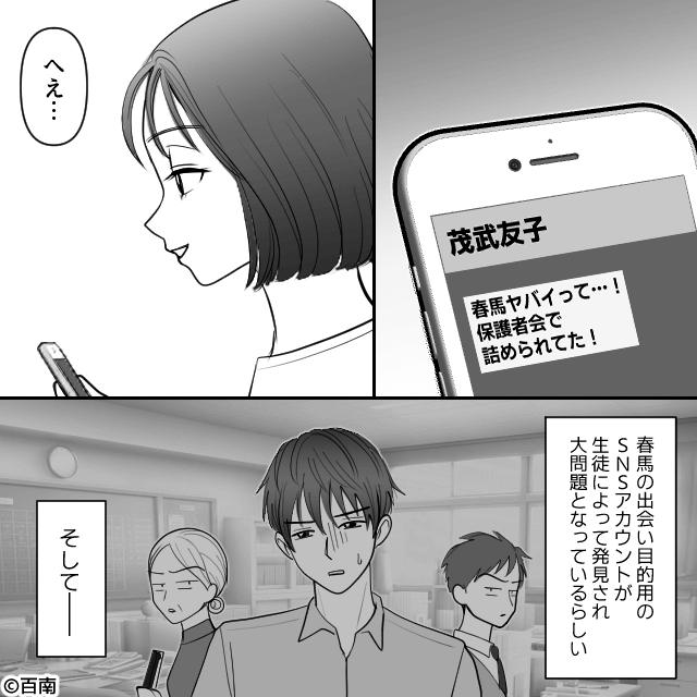 浮気の証拠を突きつけた主人公は、彼氏を家から追い出します。 数日後、彼氏のSNSアカウントが生徒によって発見され、中学校教諭の彼氏の行動は学校で大問題となったのでした。
