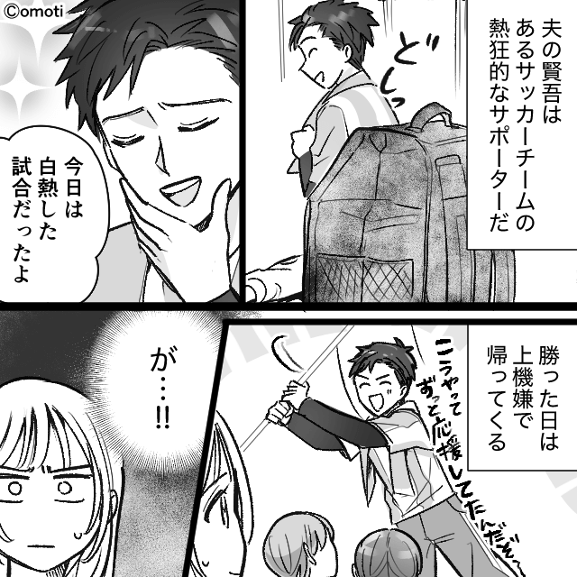 今回は『趣味に生きる父親の話』を紹介します。 帰宅した夫の、機嫌を気にする主人公。 夫はあるサッカーチームの、熱狂的なサポーターで…。