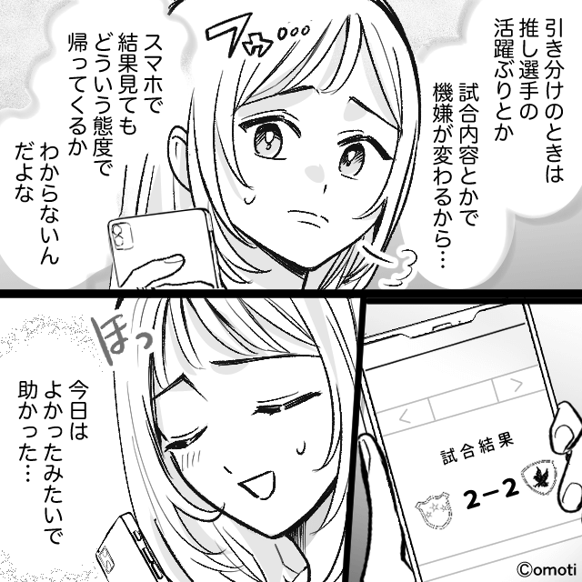主人公の夫は、あるサッカーチームの熱狂的なサポーターをしています。 試合結果によって夫の機嫌が左右されるため、家族はとても迷惑していたのでした。