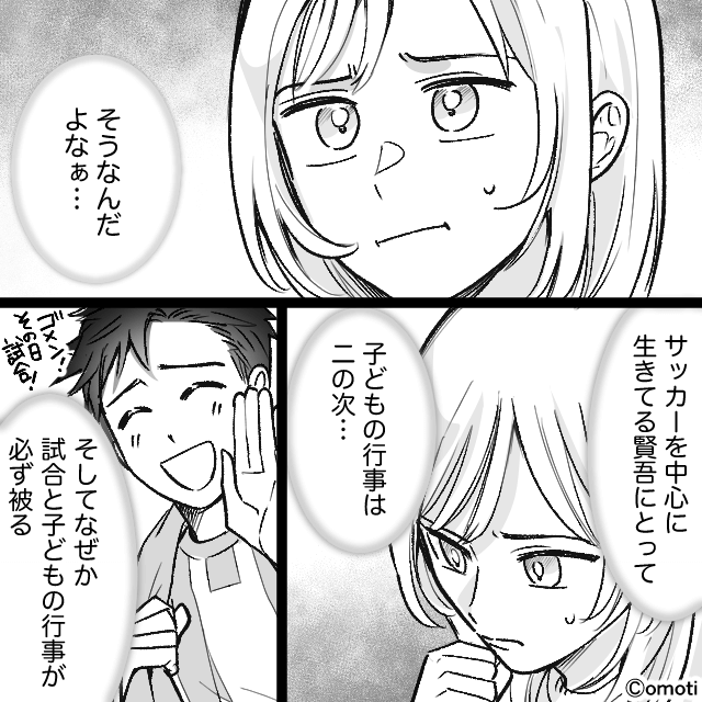 主人公は「家族からどんなふうに思われているか、わかってないんだろうな」と子どもたちよりサッカーを優先する夫にうんざりするのでした。
