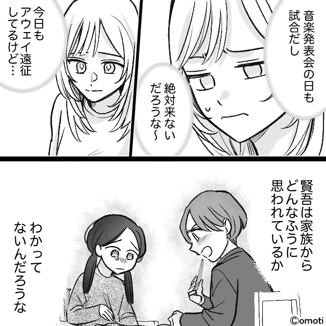ある日の食事中「来月さぁ音楽発表会があるでしょ?パパ来てくれるかな?」と言い出した娘。 しかし息子は「来てくれるわけないじゃん」と言い切ります。