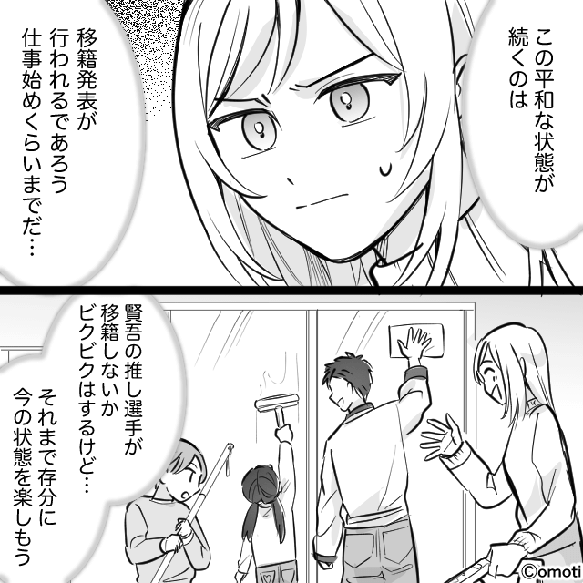 数年前、推しの選手が移籍したことで、休止期間中もずっと機嫌が悪かった夫。 同じ状況になるのを恐れた主人公は、毎日ハラハラしながらチームのSNSをチェックしていました。