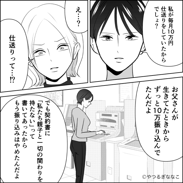 遺産がすべて自分のものになり、妹は上機嫌で日々を過ごしていました。 しかし数ヶ月後、妹は突然主人公の家に来て「お父さんの遺産取ったでしょ!?」と詰め寄ってきます。