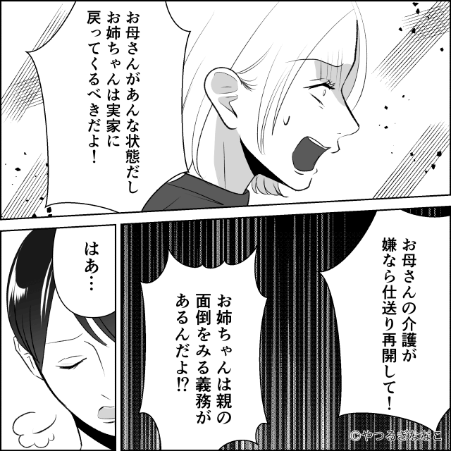 真実を知った妹は「お母さんの持病が悪化して…もう手に負えないの!」と主人公に助けを求めてきました。 そして「お姉ちゃんは親の面倒を見る義務があるんだよ!?」と言い出し…。