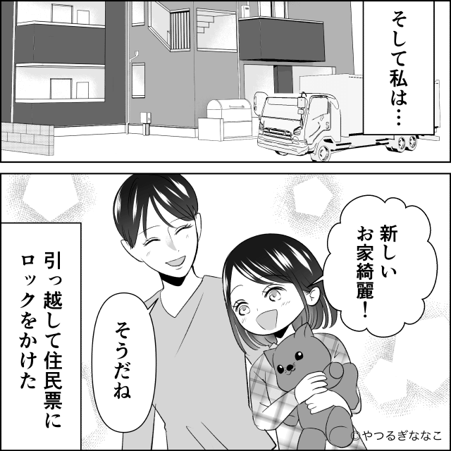 一方、主人公は新天地に引越して住民票にロックをかけ、自由になったことを喜ぶのでした。
