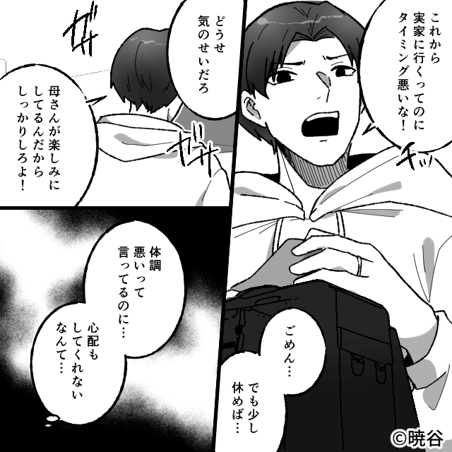 今回は『アレルギー持ちの私に「完食」を強要する義母』を紹介します。 義実家に帰省する予定の日、体調を崩してしまった主人公。 しかし夫は「どうせ気のせいだろ」と心配すらしてくれず…。