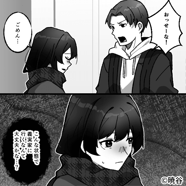 結局義実家に行くことにしたのですが、主人公は「大丈夫かな…」と不安を感じるのでした。