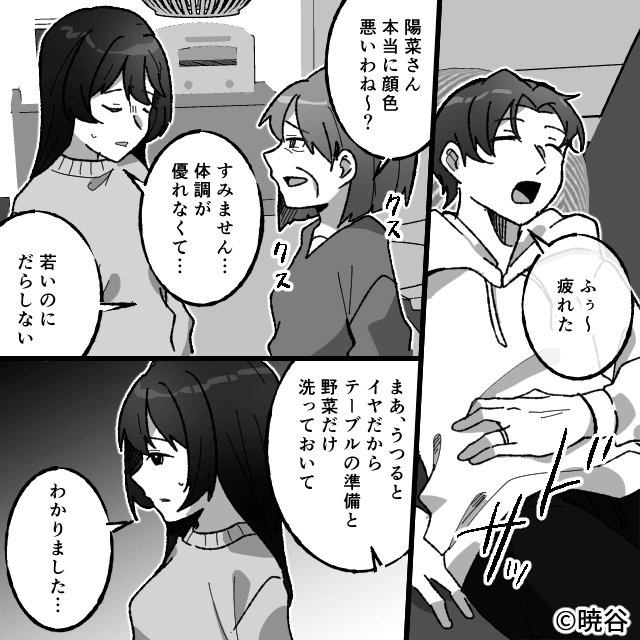 今回は『アレルギー持ちの私に「完食」を強要する義母』を紹介します。 夫に責められ、体調が悪いまま義実家に行くことにした主人公。 「こんな状態で義実家に行くなんて大丈夫かな…?」と不安を感じ…。
