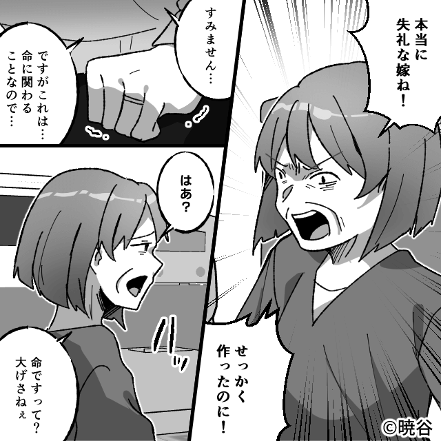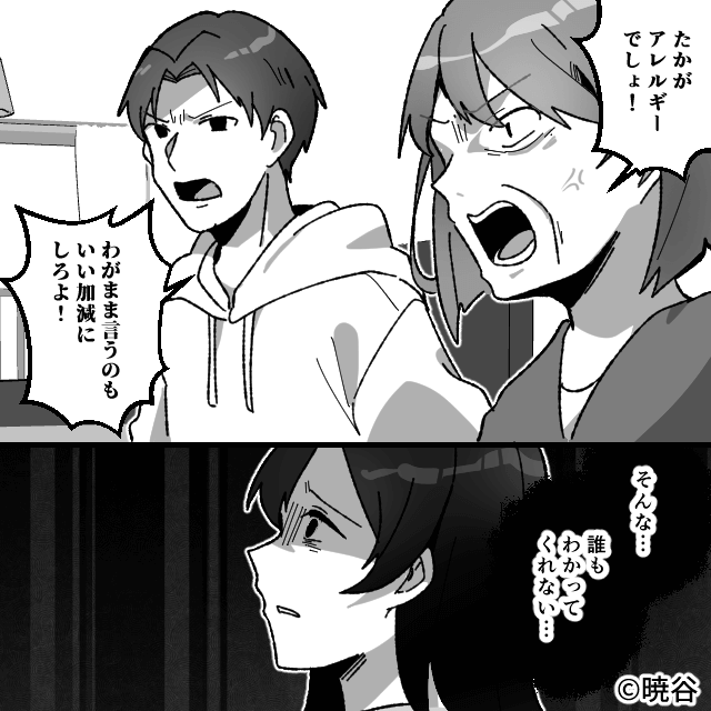 今回は『アレルギー持ちの私に「完食」を強要する義母』を紹介します。 嫌がらせで、主人公のアレルギー食品であるエビを食卓に出した義母。 そして義母は「気の持ちようよ!」と言って、料理を勧めてきて…。