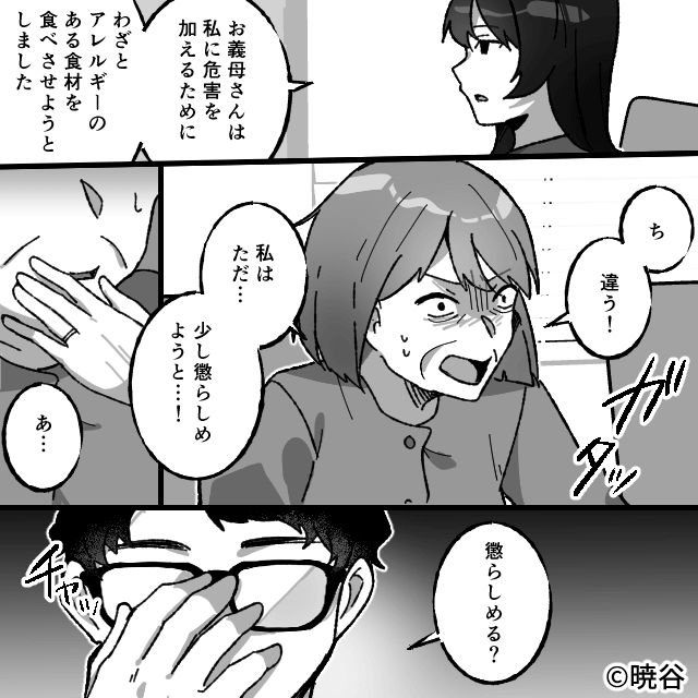 夫と義母を弁護士事務所に呼び出し、医者の診断書と義父の証言を見せた主人公。 すると義母は義父に裏切られたと感じ、ショックを受けます。