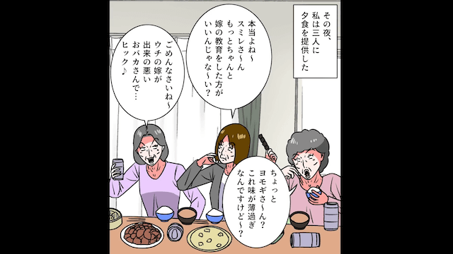 今回は『アポなし訪問する義母「使えない嫁ね!」しかし数時間後⇒まさかの反撃に遭って!?』を紹介します。 夫の指示通り、義母たちに「夕食をお召し上がりになりませんか?」と伝えた主人公。 すると義母は「それでいいのよ」と上機嫌になり…。