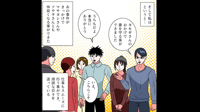 義母だけでなく、義母の友人たちも嫁いびりをしていたことが発覚し、3人はそれぞれの夫から離婚と絶縁を言い渡されます。 そして主人公は、夫との幸せな時間を取り戻したのでした。