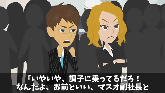 主人公が社員食堂に戻ろうとすると、また同僚たちがやってきました。 そして同僚は「お前といい、副社長といい、2人して俺たちを悪く言いやがって!」と怒ってきて…。