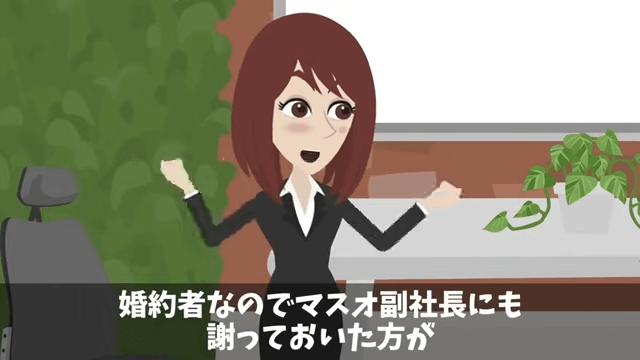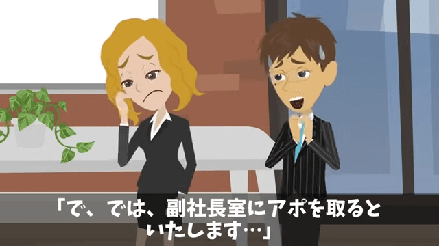 同僚たちから許してほしいと言われた主人公は「私は別にいいわよ?」と言いました。 そして主人公が、副社長にも謝ったほうがいいと同僚たちに伝えると、同僚は「で、では、副社長室にアポを取るといたします…」と言い…。