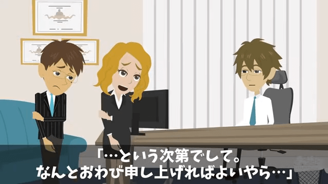 今回は『食事会で…私の正体を知らない同期「予約の人数に入ってないから帰れ(笑)」直後⇒周囲が青ざめたワケ』を紹介します。 同僚たちから謝罪された主人公は「私は別にいいわよ?」と言ってから、婚約者である副社長にも謝ったほうがいいと伝えました。 すると同僚たちは「たしかにそうですね…」「では、副社長室にアポを取るといたします…」と言い…。