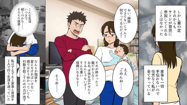 今回は『両親の前で嘘をつく夫「育児は全部俺がやっていて~」私「は?」』を紹介します。 結婚前、夫は家事や子育てに協力することを両親と約束していました。 しかし夫は約束を守らず、主人公がつわりで苦しんでいたときも、息子が生まれてからも、一切家事をしようとしなかったのです。
