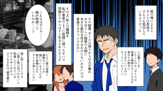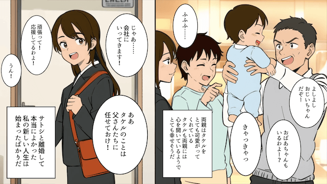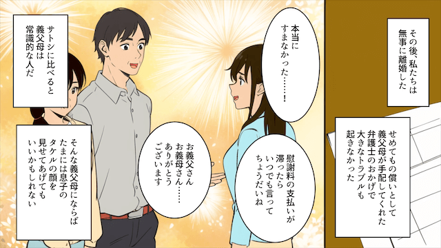 義両親にも見放された夫は、その後、家事ができないことでみすぼらしい格好になってしまい、会社でも孤立します。 一方、主人公は再就職し、両親と息子と幸せに暮らしたのでした。