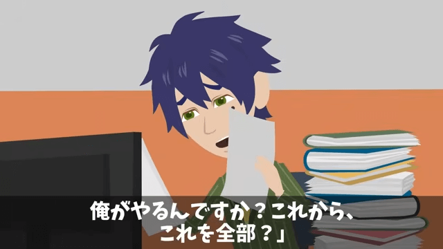 今回は『新社長が無視してくるので…俺「辞めますね」社長「作戦成功!」しかし後日⇒会長「なぜ彼を辞めさせたんだ!?」』を紹介します。 女性社員は「これ、今日中にやっといてね」と言い、大量の資料を主人公の前に置きました。 それを見た主人公が「な、なんですか?この資料の山は…」と尋ねると…。