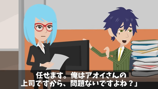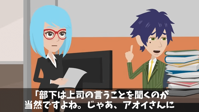 部下が主人公を助けようとすると、女性社員は「ちょっと、あんた。出しゃばんないでよ!」と怒りました。 そこで主人公は、自分は部下の直属の上司だから仕事を頼むのは問題ないと女性社員に伝えたのです。