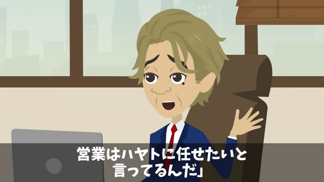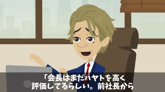 女性社員は主人公について「どうにかできないんですか?」と社長に尋ねました。 すると社長は、会長が主人公を高く評価していることを説明して…。