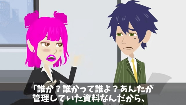 会議に使う資料が破られていることに気がつき、主人公が困惑していると、女性社員が「もしかして、会議に使う大切な資料、ダメにしちゃったわけ?」と言ってきました。 さらに女性社員は、主人公を責めるようなことを言い…。
