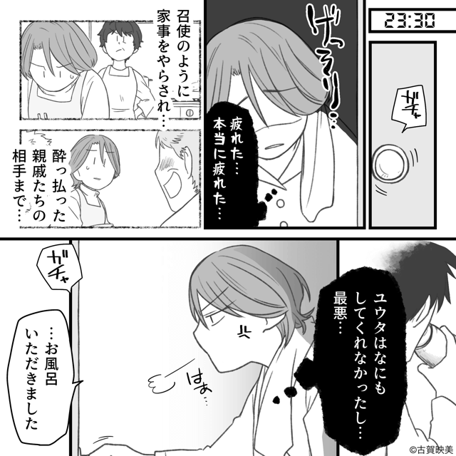 今回は『義実家、全員敵。』を紹介します。 親戚たちにセクハラ発言をされ、夫に助けを求めた主人公。 しかし夫は無視し、主人公は絶望するのでした。