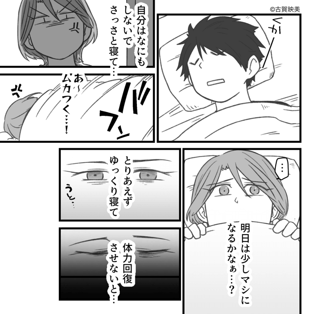 1日中召使いのように扱われ、疲弊した主人公。 すると義母は「ゆっくり休んで、いい夢を」と笑顔で声をかけてくれ、主人公は戸惑いながらも眠ります。