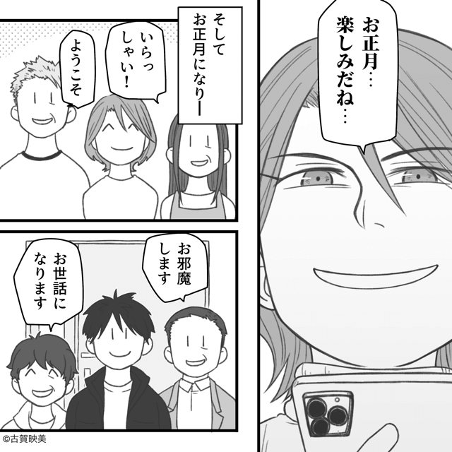 母との電話のあと、焦った夫から電話がかかってきたため「年始は私の実家に来ない?」と提案した主人公。 すると夫は「おいしいもん食えるんだろ?行くよ」と同意して、年始に義両親を連れて実家に来ました。