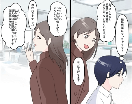 上司は明らかに主人公を見下しており、いつも雑用を押しつけてきます。 その日も雑用を押しつけられた主人公を見て、同僚が「大丈夫?」と声をかけてくれて…。