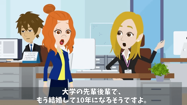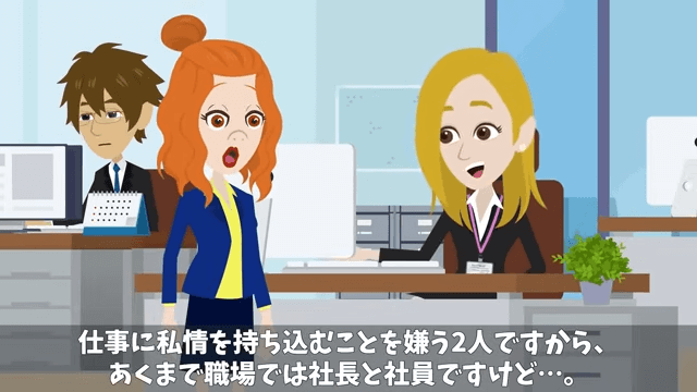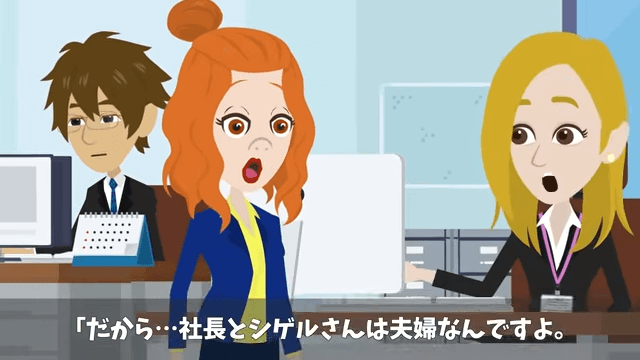 主人公と社長が夫婦だと知り、課長は「…えっ?」と驚きます。 そこで同僚は、主人公と社長が結婚してもう10年になることを課長に教えました。