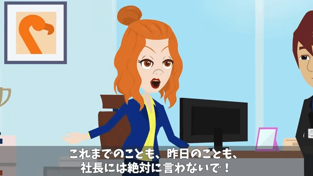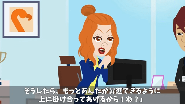 課長は「これまでのことも、昨日のことも、社長には絶対に言わないで!」と主人公に頼みます。 そして課長は「そうしたら、もっとあんたが昇進できるように上に掛け合ってあげるから!ね?」と言いました。