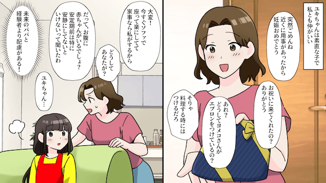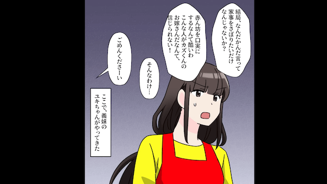 主人公の妊娠が判明しても夫と義母の態度は相変わらずで、主人公に家事を押しつけてきました。 そんなある日、家に来た義妹が妊娠中の主人公を気遣ってくれて…。