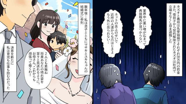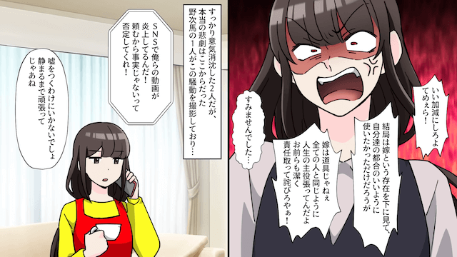 社長が義妹の彼氏だということが判明し、夫と義母は義妹にすがりましたが、義妹は2人に絶縁を突きつけます。 そしてその後、野次馬が撮った動画がSNSで炎上し、夫と義母は近所の人から白い目で見られるようになったのでした。